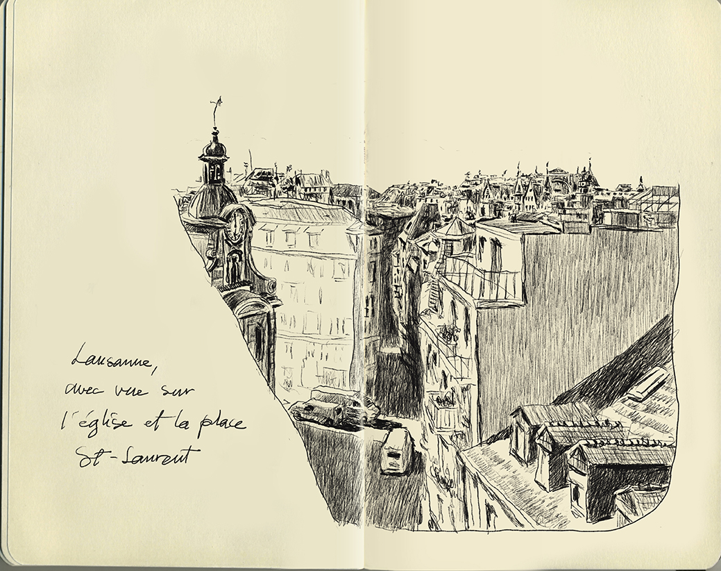 moleskine promenade*41 July 18, 2023 | ronald juliet Lausanne, with a view of Church and Place St-Laurent