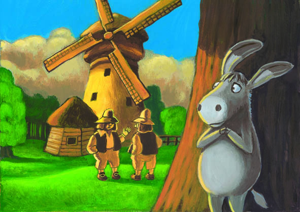 Voici des images extraites des 2 kamishibaï pour enfants que j’ai réalisés il y a quelques années. Il y a “les musiciens de Brême”, conte des frères Grimm, paru aux éditions Paloma, et “l’eau du puits”, aux éditions du Crede, un conte que j’ai écrit sur le partage. Chaque histoire comprend 16 planches couleur, avec le texte au verso, dimensions format A3.Vous pouvez lire ci-dessous les explications concernant cette technique de narration particulière.